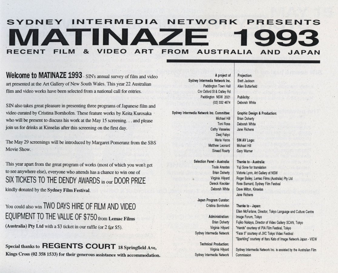 Matinaze is an annual survey of recent Australian film and video art. Matinaze 1993 also includes an exciting program of recent Japanese film and video art curated by Cristina Bornhofen.