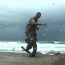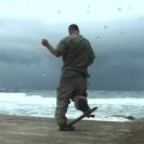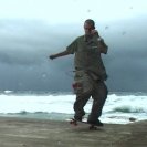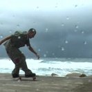Storm Sequence is Gladwell’s seminal work and depicts him skateboarding on the edge of a concrete drop at Sydney’s Bondi Beach. Gladwell – a prolific and skilful free-style skateboarder – pirouettes and spins within a contained space. Incorporating an organic, liquid-like soundtrack by Sydney composer Kazumuchi Grime, the footage is slowed down and movement, which in real time would have a jerky rhythm, becomes graceful, emphasising the relationship between the skater and the environment. As a storm approaches on the horizon, Gladwell continues to skate as the sky turns black until eventually the rain becomes too heavy for him to continue.